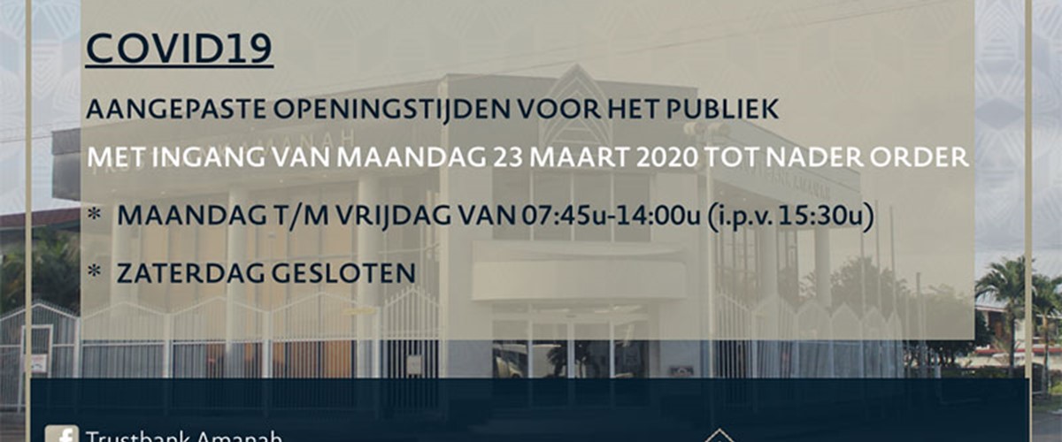 Hierbij maken wij bekend dat in verband met de ontwikkelingen betreffende COVID19 (corona-virus) wij genoodzaakt zijn om onze openingstijden aan te passen.