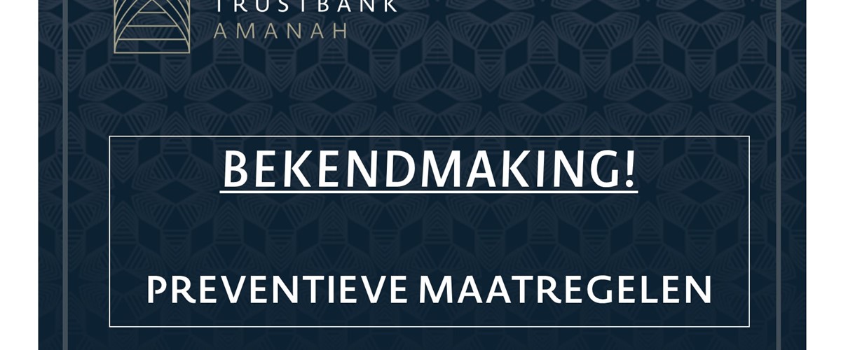 Voorts verzoeken wij u, indien u de symptomen van COVID19 of andere griepsymptomen vertoont om niet naar de bank te komen, maar een bericht te sturen naar info@trustbankamanah.com of een persoonlijk bericht via onze facebook pagina voor uw bankzaken en voor internet & mobiel bankieren naar digitalbanking@trustbankamanah.com