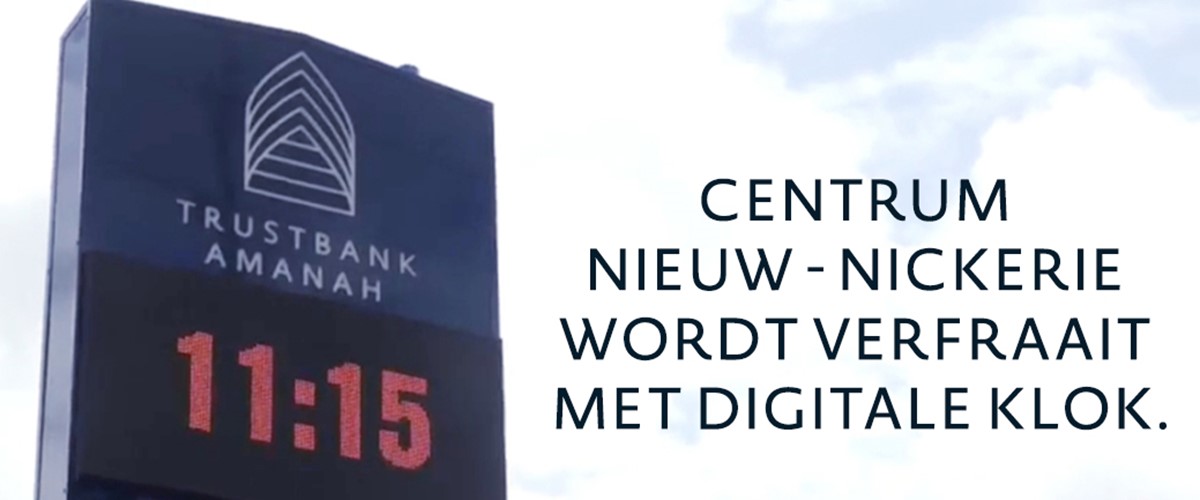 Trustbank Amanah heeft in verband met haar 5 jarig bestaan in Nickerie, de Nickeriaanse gemeenschap een digitale klok geschonken. CEO Maureen Badjoeri kondigde de schenking aan tijdens de 1e lustrum viering op 7 maart jl. De digitale klok vertoont zowel de tijd als de temperatuur. Beide functionaliteiten kunnen een belangrijke rol spelen voor de economische activiteiten in het district alsook voor elk individu. De schenking is mede mogelijk gemaakt door SIB Signs & Designs.