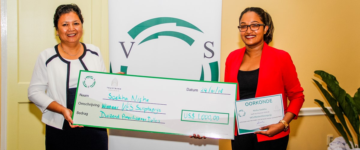 De prijs voor de VES beste scriptie 2017 kwam uit handen van Trustbank Amanah. Hiermee onderkent en ondersteunt de bank het belang van educatie, waarbij een bijdrage wordt geleverd aan persoonlijke en maatschappelijke ontwikkeling. Trustbank Amanah heeft met heel veel genoegen deze geste aangeboden. CEO Maureen Badjoeri overhandigde de symbolische cheque ter waarde van USD1000,- aan de winnares Nisha Soekha. De beste scriptie heeft als titel :The Empirical link between perceived customer value and customer retention within the fast-food industry.